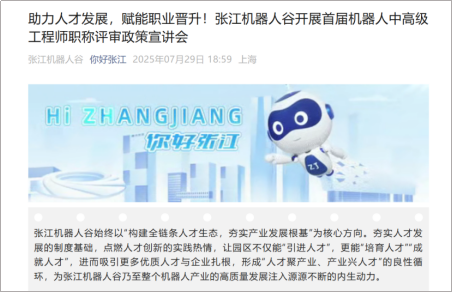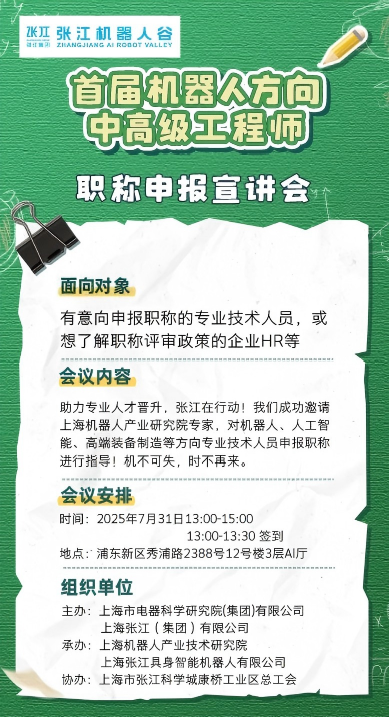 7月31日,为使本市各申报人员更清楚了解职称评审要求,星空电竞(中国)机器人有限公司官网联合张江机器人谷成功举办上海市首届工程系列数字技术专业职称申报政策宣讲会。会议通过申报范围、评审流程、材料准备、政策亮点等方面的深度解读,为机器人、智能制造等产业前沿领域专业技术人才提供权威申报指导。