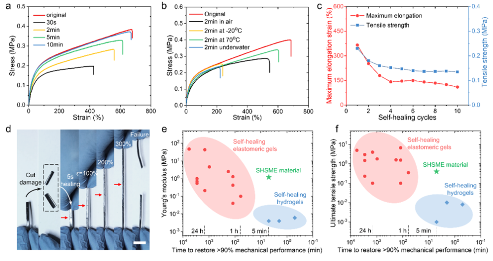 在切断-自愈合-拉伸测试的表征下,材料展示了优异的自愈合能力:在室温条件下,5s内可恢复300%的拉伸应变,10min内几乎完全恢复力学强度。SHSME在自愈合效率和力学强度之间达到了良好的平衡:有着媲美自愈合水凝胶的快速自修复能力,同时接近硅橡胶类材料的拉伸强度。此外,SHSME在水下和低温(-20oC)条件下也成功实现愈合效果。