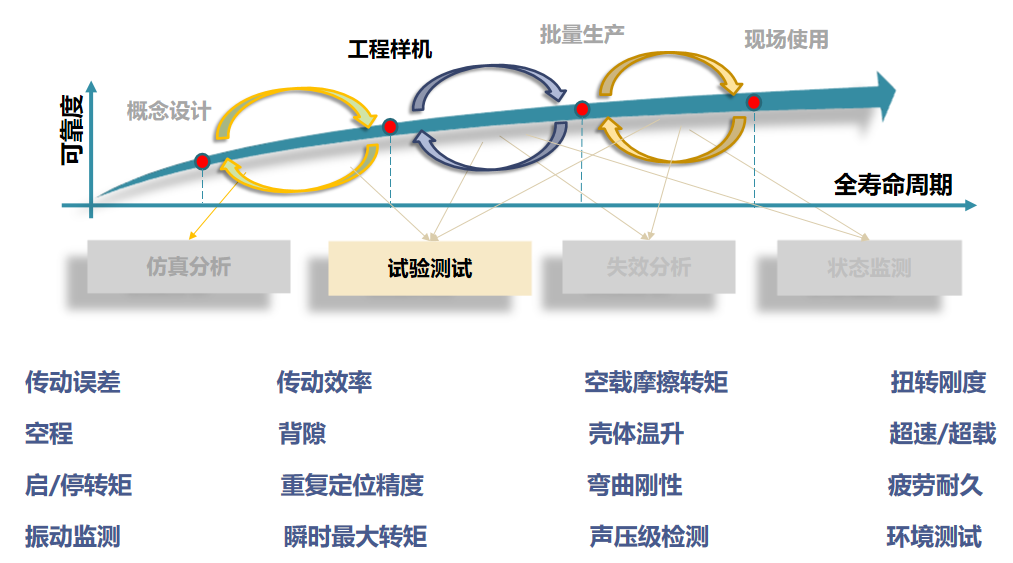 在机器人用精密减速器测试方面,平台具备性能试验、刚度试验、噪音试验、寿命试验和环境试验全方面测试能力,下图展示的是星空电竞目前主要测试设备。