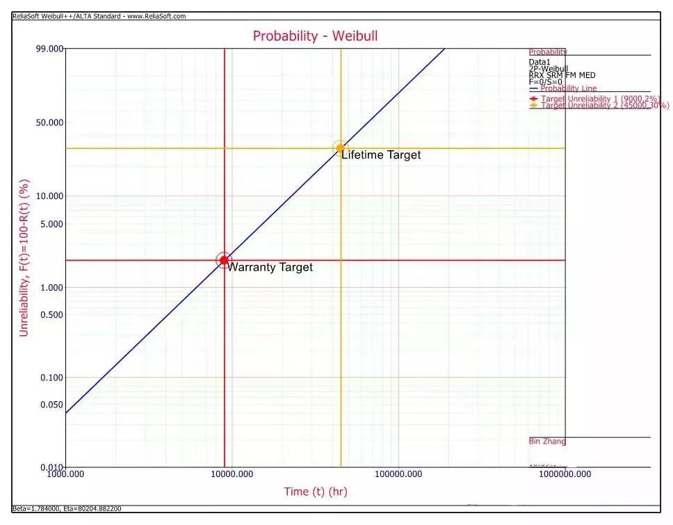 在产品开发设计阶段,为了全面了解产品的可靠性水平,需要对产品的失效数据进行量化分析. 而这就需要对产品进行Test to fail 的试验,然后通过威布尔数据分析方法来计算出当前样本的可靠性数据。好处毋庸置疑,可以比较准确地知道产品的失效信息和可靠性量化数据。但缺点就是,不知道失效什么时候会发生,也许需要很长的时间。