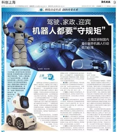 9月3号,新民晚报科创上海版面就星空电竞(中国)机器人有限公司官网、上海电器科学星空电竞、上海大学、中国科学技术大学联合起草国内首份《服务机器人智能化评测方法》系列国家标准进行报道。文章以《机器人都要“守规矩”》为标题,期待建立中国服务机器人智能化标准,开展国家检测机构规范测试,并促进国产服务机器人产业的良性发展。