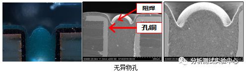 同时,对比PCB上无异物覆盖的正常PTH孔,发现正常孔内阻焊与孔壁结合良好,无裂缝,孔铜未被腐蚀,信号导通良好。