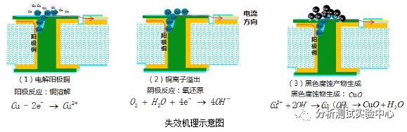 根据研究表明,在沿海高盐、高湿的环境中,物体表面会形成薄薄的一层水膜,且当相对湿度在65%-80%的空气中,物体上的水膜厚度为0.001~0.1μm,在PCB带电工作时,水膜与孔铜等共同构成了电解槽,发生电化学反应,结果生成黑色腐蚀物,如下图: