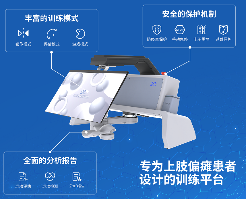 上肢镜像康复机器人式一款针对脑卒中患者等上肢偏瘫患者设计的上肢康复镜像训练机器人系统,具有评估、镜像、游戏三种训练模式,并生成相应的训练报告。